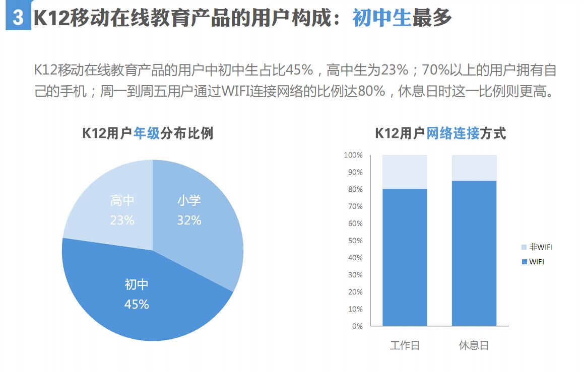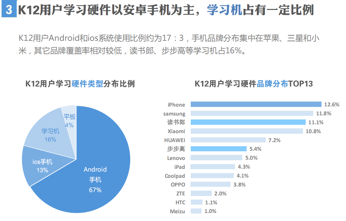 百田教育今日發(fā)布K12在線教育行業(yè)研究報告。報告顯示,K12移動在線教育產品的用戶中,初中生最多;用戶活躍度在晚上八點達到最高峰;用戶活躍時段在晚上八點達到最高峰值;K12用戶學習硬件以安卓智能手機為主,其中學習機占有一定比例。