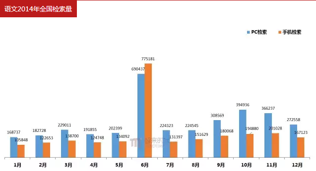 三大主科之一的語(yǔ)文,2013-2014年的全年檢索量居于七個(gè)學(xué)科第二名,而全年的檢索量出現(xiàn)兩個(gè)高峰值,分別在6月、10-11月,而6月的總檢索量是10-11月的近2倍,全年來(lái)看一枝獨(dú)秀。而秋季學(xué)期的檢索量普遍高于春季學(xué)期,其中10月份最高。語(yǔ)文在電腦端和手機(jī)端的檢索量差距,在七個(gè)學(xué)科中是最小的,電腦端占少許優(yōu)勢(shì),但在檢索量最高的6月份,手機(jī)端勢(shì)頭強(qiáng)勁,成功反超。