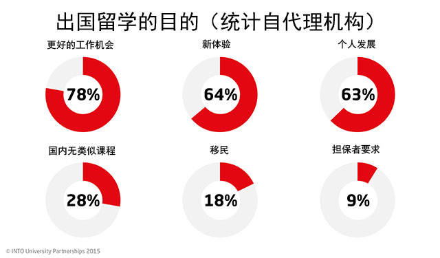與此同時(shí),中國留學(xué)生更多以“個(gè)人發(fā)展”為主要目的。74%的中國留學(xué)中介機(jī)構(gòu)將“個(gè)人發(fā)展”列為留學(xué)生最大的動機(jī)。相比其他國家的留學(xué)生,“更好的就業(yè)前景”對大多數(shù)中國留學(xué)生來說只是一個(gè)次要的留學(xué)目的。