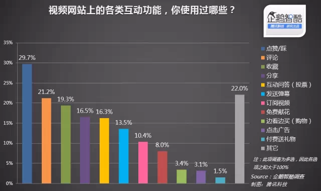 在視頻網(wǎng)站提供的各類互動功能中,點贊/踩是用戶使用率最高的功能,在調(diào)查者中的占比為29.7%。除了因為該類互動行為簡單且易于表達(dá)喜好外,并不強(qiáng)制要求用戶登錄的功能屬性也讓用戶操作方便。
