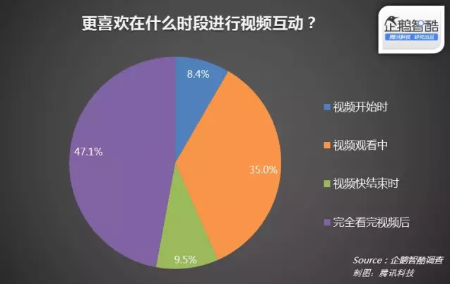 在設(shè)置用戶互動功能時,觀看結(jié)束后和觀看中是提供互動的好機(jī)會。47.1%的用戶表示,他們更喜歡在完全看完視頻后進(jìn)行互動;35%的用戶則表示喜歡在視頻觀看中參與互動。