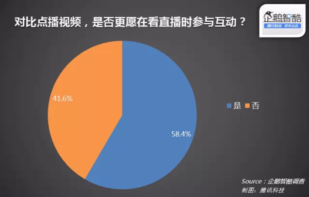 對比點播視頻,用戶在看直播視頻時的互動意愿更高。接近60%的用戶表示更愿意在看直播時參與互動。這也和直播視頻本身的特點有關(guān),當(dāng)大量用戶同時在線且聚焦在同一個事件時,互動參與的熱情提升,在此基礎(chǔ)上也易于形成更多元的互動行為。