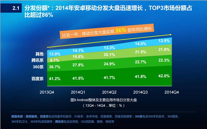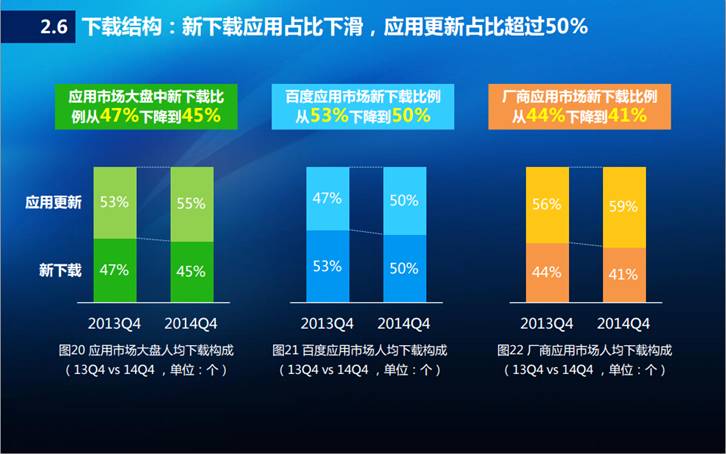 移動分發(fā)大盤增長迅速,在2014年實現同比增長36%;另一方面,用戶應用下載移動化持續(xù)加劇,手機客戶端和手機網頁成為用戶下載應用的主要渠道。兩個渠道在用戶應用下載中的占比分別從2013年Q4的44%和23%,提高到2014年Q4的53%和25%。