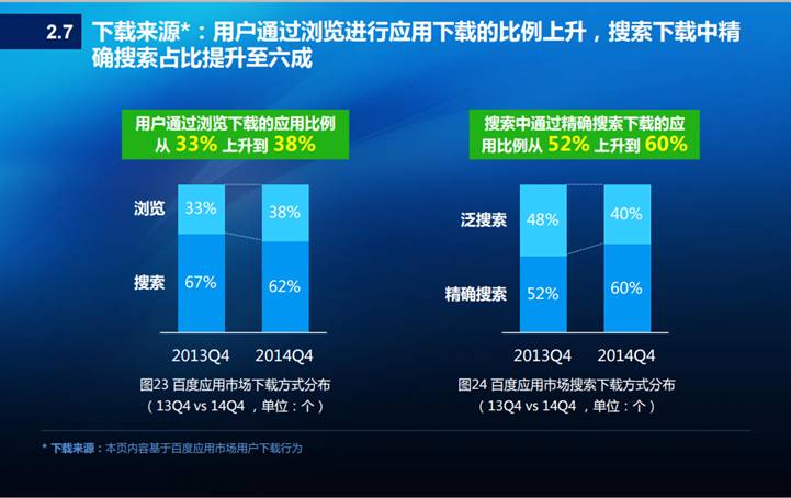 用戶應用下載的移動化趨勢,讓各大應用商店從中受益,應用市場的整體用戶規(guī)模2014年Q4實現同比47%的增長,用戶不僅更愛“逛”應用商店,而且更樂于在通過搜索的方式來下載應用,報告數據顯示,用戶精確搜索為百度應用商店貢獻了超過6成的下載量。