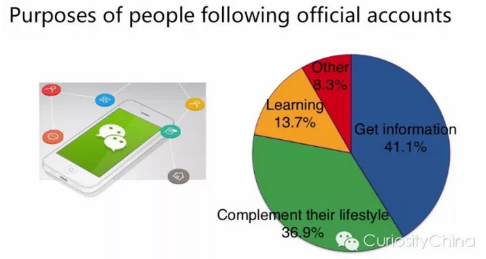 用戶關(guān)注公眾號主要目的是獲取資訊41.1%,其實(shí)是方便生活36.9%和學(xué)習(xí)知識13.7%。