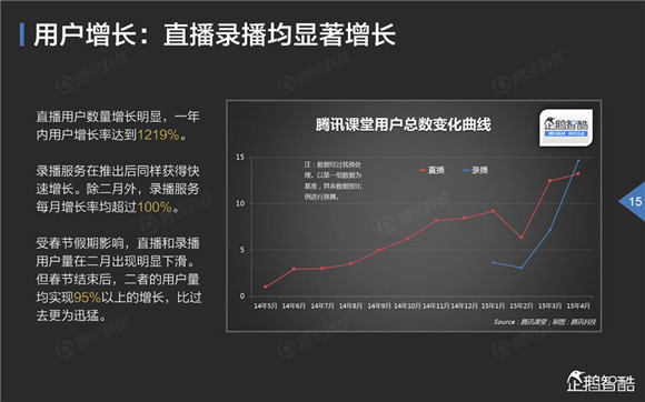 今日企鵝智庫發(fā)布在線教育報(bào)告,報(bào)告顯示,中國是除印度之外在線教育增長最快的國家,增長率為52%。直播用戶數(shù)量明顯,一年內(nèi)用戶增長率達(dá)到1219%。去年,付費(fèi)用戶增長明顯,一年內(nèi),付費(fèi)用戶的增長率達(dá)到1670%,比整體用戶的增幅還要高。19點(diǎn)到24點(diǎn)是用戶在線的高峰時(shí)段。用戶日均人均直播時(shí)長波動(dòng)較大,整體呈增長趨勢。月度增長率高達(dá)52 4%。