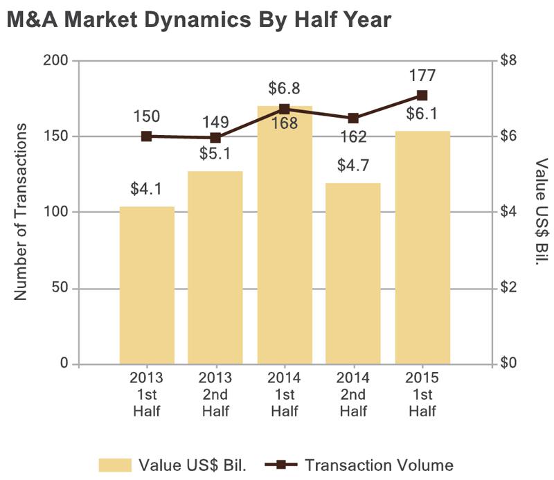圖1:以半年為單位的并購交易市場行情變化(柱狀圖——總金額,以10億美元為單位;折線圖——交易數(shù)量),數(shù)據(jù)來自投資銀行Berkery Noyes