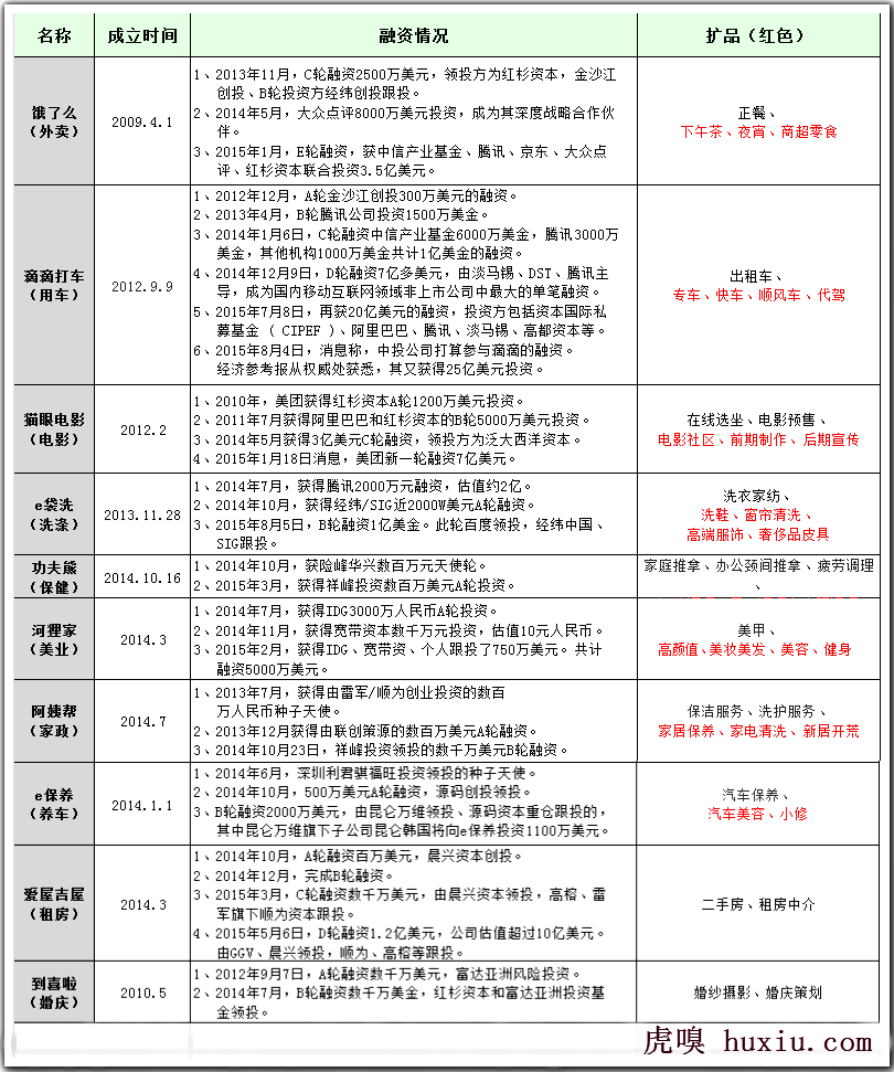 除了e袋洗,最近兩個(gè)月來(lái)集中擴(kuò)品類的有河貍家、阿姨幫等,與擴(kuò)張業(yè)務(wù)城市數(shù)一樣,品類擴(kuò)張有助于原本“起跑線”單一的O2O拿錢。下圖,虎嗅選取了10家具有代表性O(shè)2O公司: