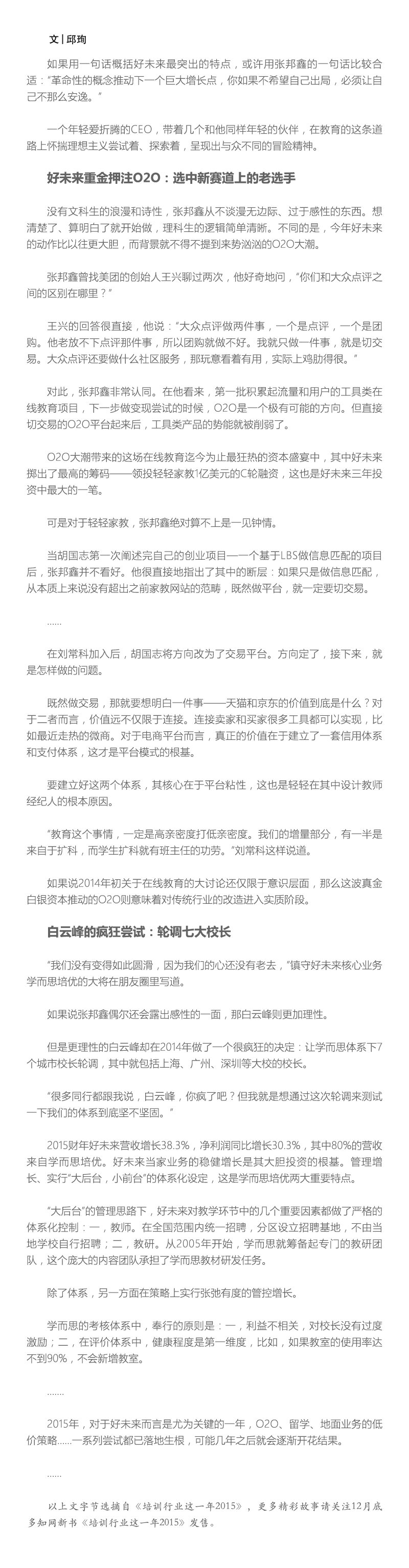 如果用一句話概括好未來(lái)最突出的特點(diǎn),或許用張邦鑫的一句話比較合適:“革命性的概念推動(dòng)下一個(gè)巨大增長(zhǎng)點(diǎn),你如果不希望自己出局,必須讓自己不那么安逸。”
