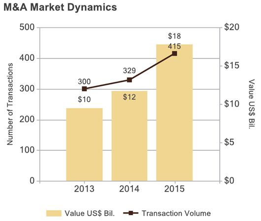 多知網(wǎng)1月25日消息,據(jù)投資銀行BerkeryNoyes公布的一份最新報告顯示,2015年全球教育行業(yè)累積發(fā)生415起并購活動。其中,為高等教育機構(gòu)提供數(shù)據(jù)分析解決方案的Ellucian估計有10美元收購,其次是LinkedIn以15億美元收購Lynda.com。