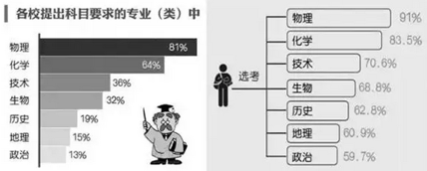 ?其次,有些專業(yè)雖提出選考科目要求,但總體來講考生選擇面還是增加的。設(shè)限專業(yè)(類)最多的是物理81%,而后是化學(xué)64%,再次是涉及36%的技術(shù)。雖如此,除非特別頂尖的學(xué)校,如清華及非常工科的專業(yè),如物理、機(jī)械、信息技術(shù),或數(shù)理經(jīng)濟(jì)、數(shù)學(xué)金融需數(shù)學(xué)才對(duì)物理做出強(qiáng)制要求,而這些頂尖院校或?qū)I(yè)不足1%;況且各高校專業(yè)(類)設(shè)限選考科目至多有三門,考生只要選其中1門,即可報(bào)考,一般院校物理化學(xué)在一起的多,可進(jìn)行選擇。