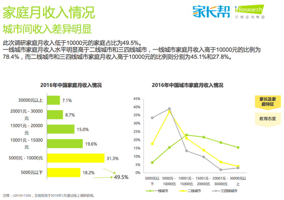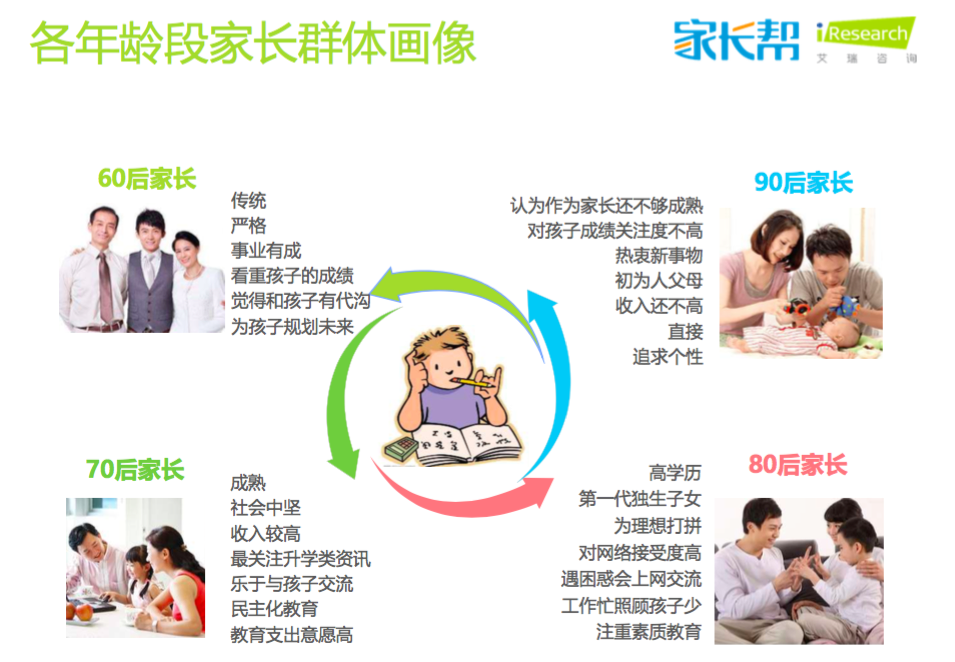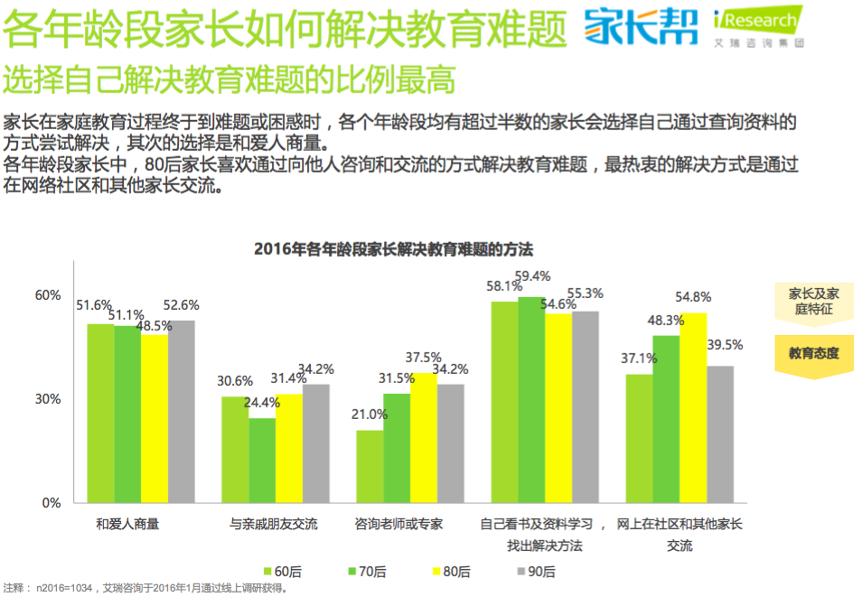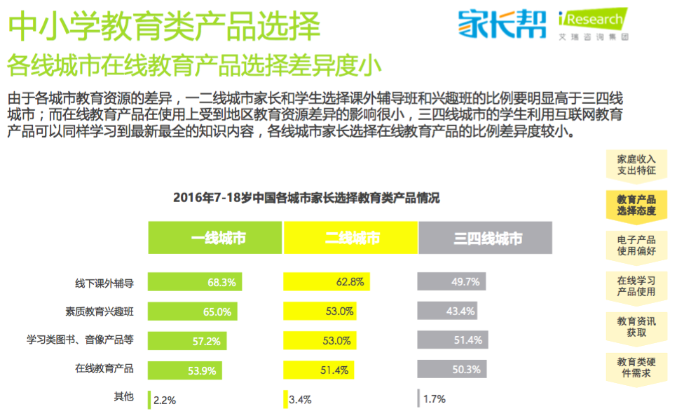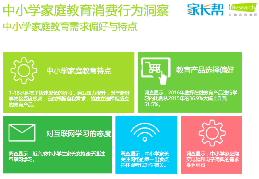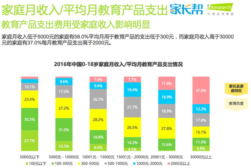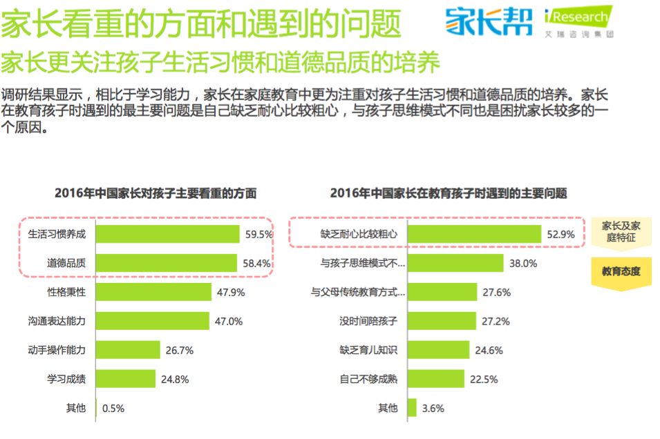 近日,好未來家長幫聯(lián)合艾瑞咨詢發(fā)布了《2016年中國家庭教育消費者圖譜》,通過對1000多位家長在線調(diào)研、40萬PC樣本和200萬手機樣本的監(jiān)測,勾勒出當(dāng)下中國家庭的教育消費特征、教育理念,以及不同家庭對二胎政策、在線教育、低領(lǐng)留學(xué)等熱門話題的傾向性。
