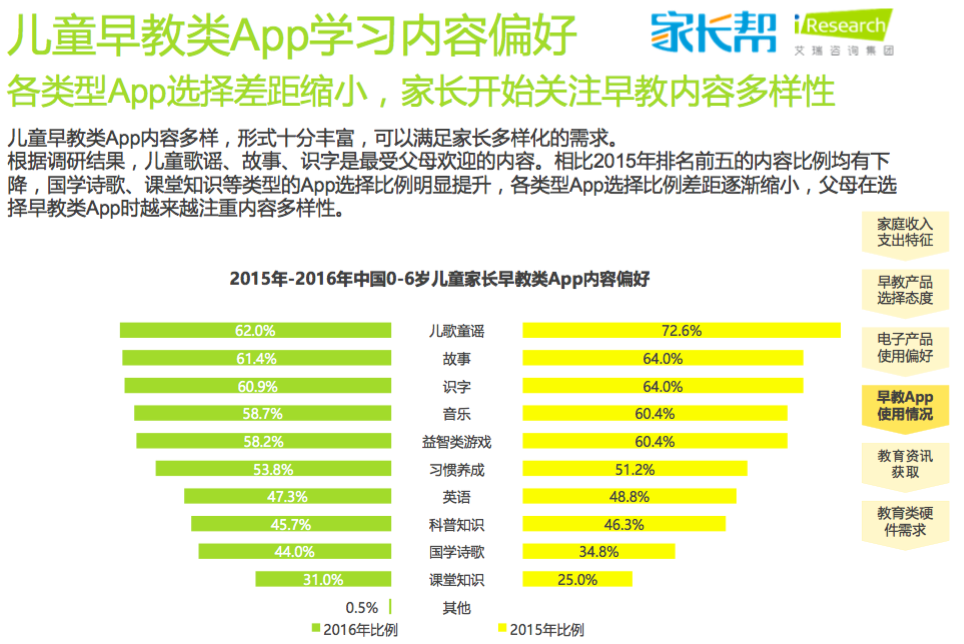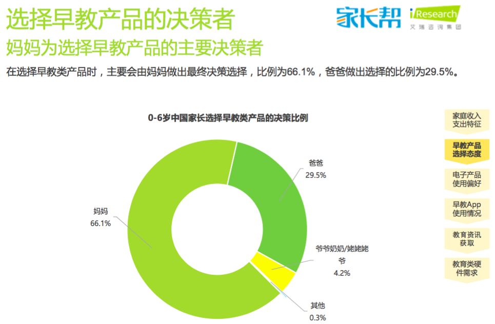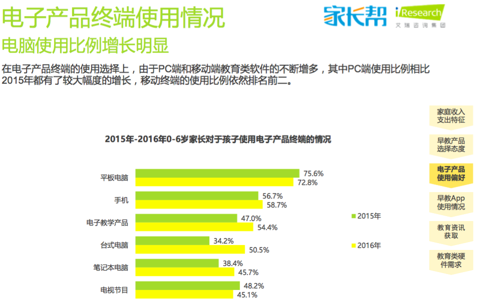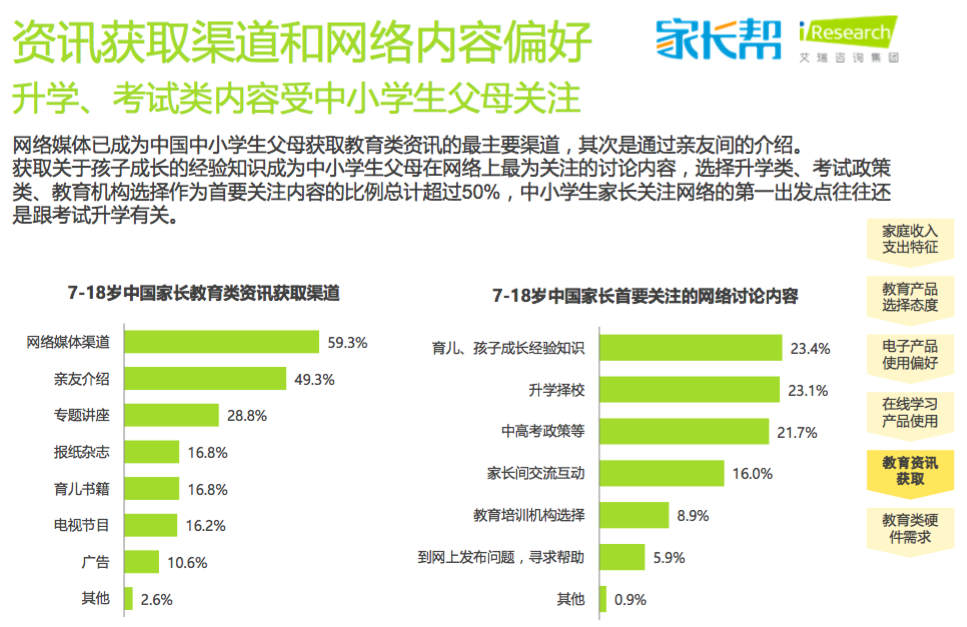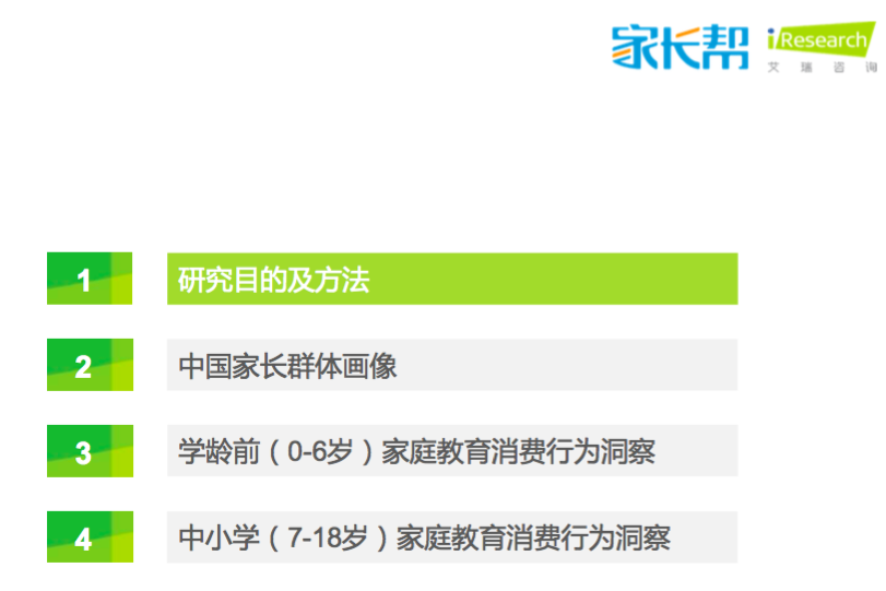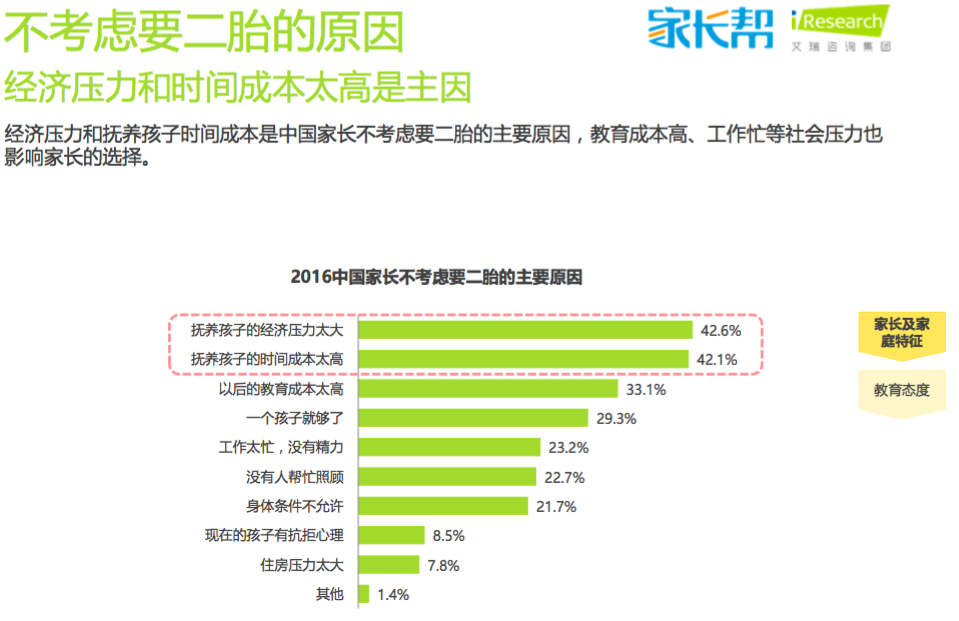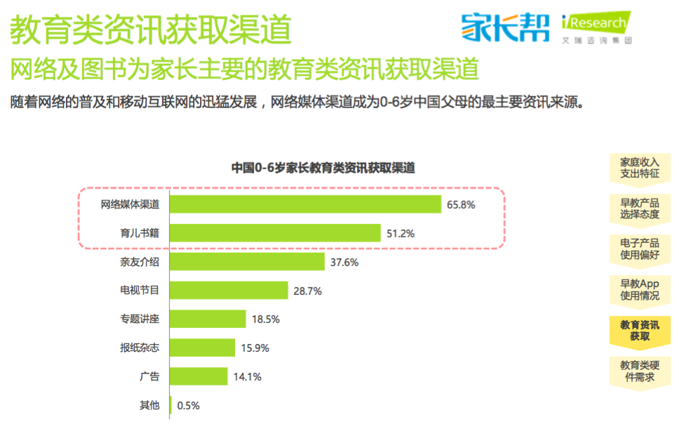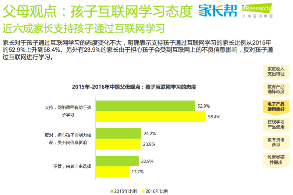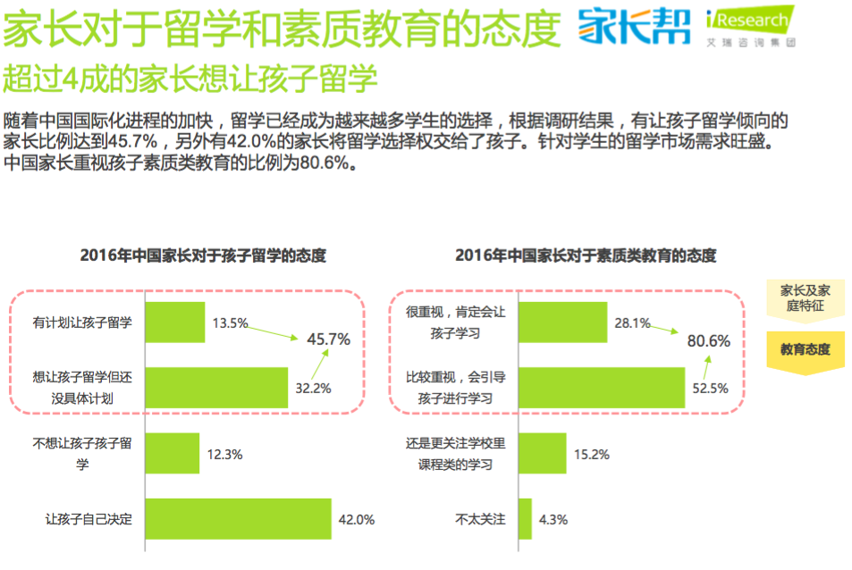 通過對樣本調(diào)查發(fā)現(xiàn),近七成家庭沒有二胎計劃;五成家長選擇在線學(xué)習(xí)產(chǎn)品;素質(zhì)教育與低齡留學(xué)漸漸成為家長教育新風(fēng)向。