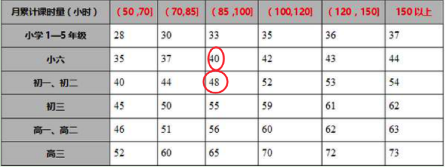 教師的月累積課時量和年級作為橫縱兩個維度直接決定課時費,分成六個檔級,如下圖所示。