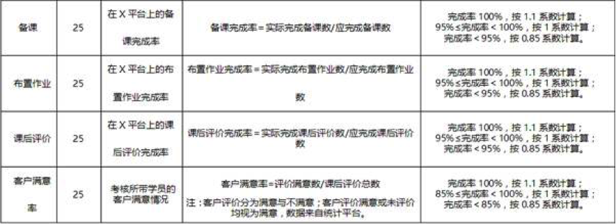 【KPI系數(shù)=(備課率*25+布置作業(yè)*25+課后評價*25+客戶滿意率得分*25)/100】