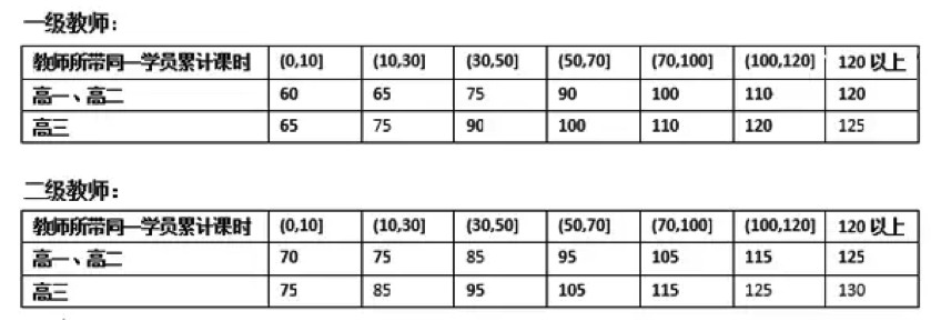比如,A教師4月份總上課課時數(shù)是60小時,其中高一學員a本月上了20課時(a在A老師這的累計課時:55),高二學員b本月上了30小時(b在A教師這的累計課時:95),高三學員c本月上了10小時(c在A教師這的累計課時:45),根據(jù)下表,