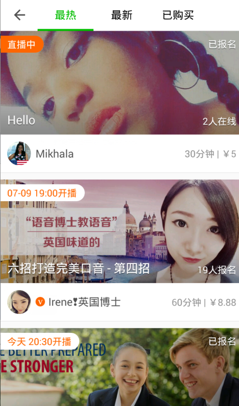 伴魚直播定位C2C直播,主播分享不同的主題內(nèi)容,比如“海外求生求學(xué)法則”,“BBC播音員英語語音訓(xùn)練技法”,“加拿大留學(xué)生活之工作篇”等。直播收費(fèi)較低,大多在10元以下。