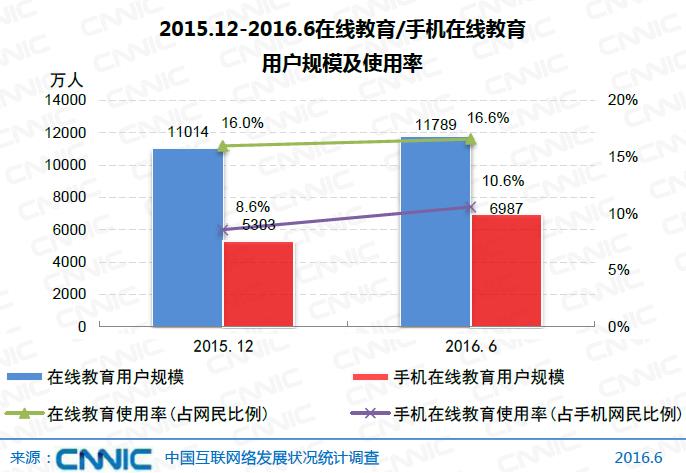 CNNIC發(fā)布第38次《中國(guó)互聯(lián)網(wǎng)絡(luò)發(fā)展?fàn)顩r統(tǒng)計(jì)報(bào)告》顯示,2016年上半年,我國(guó)在線(xiàn)教育用戶(hù)規(guī)模達(dá)1.18億,在線(xiàn)教育用戶(hù)使用率為16.6%;手機(jī)在線(xiàn)教育用戶(hù)規(guī)模為6987萬(wàn),手機(jī)在線(xiàn)教育使用率為10.6%。