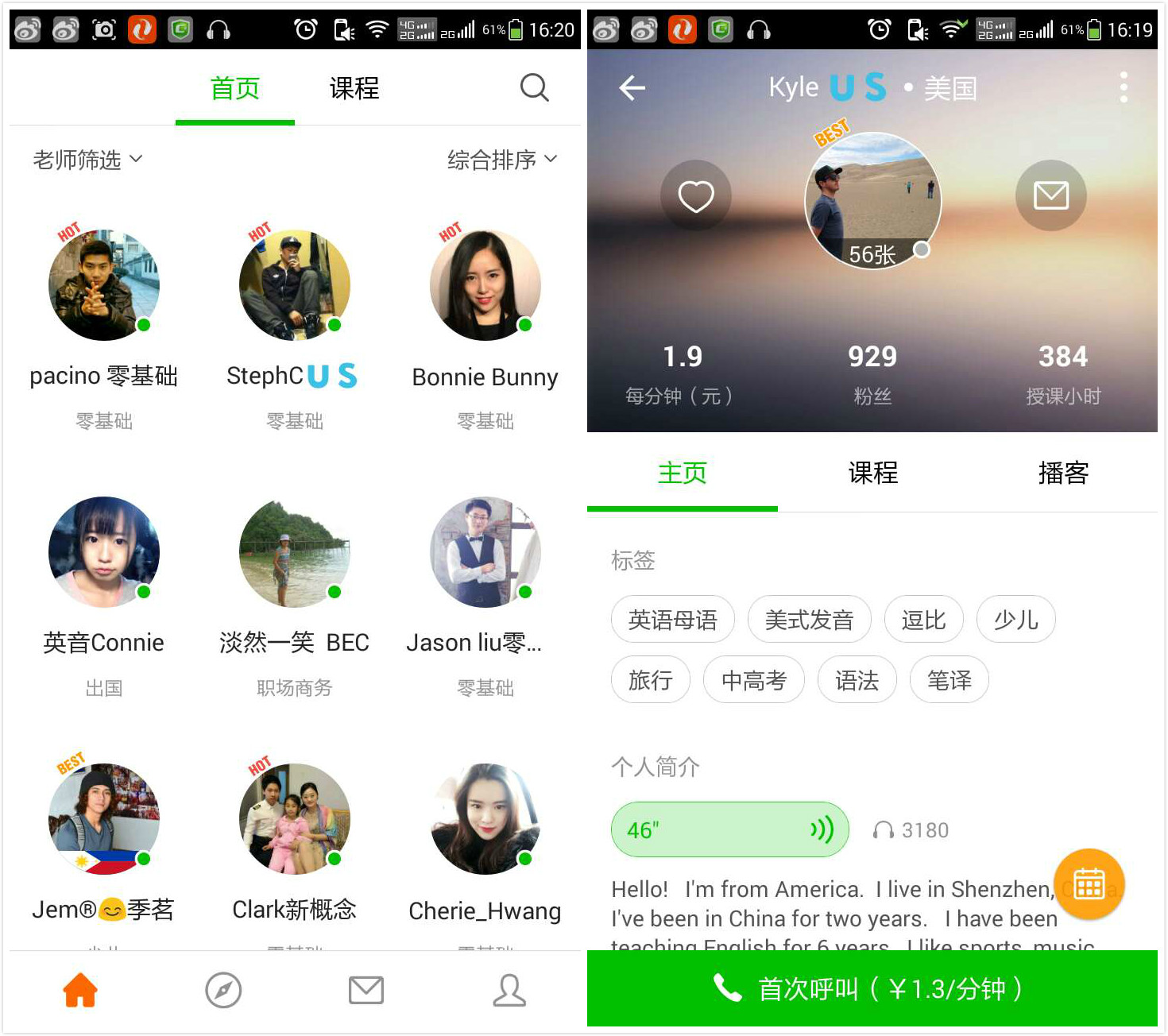 “老師”界面顯示各位老師擅長的教學方向。頭像右下角的綠點表示在線,紅點表示占線,灰點則是下線。熱門老師會有“BEST”或“HOT”標記。在老師個人主頁下方,可以觀看直播回放和收聽其他學員的一對一通話錄音。
