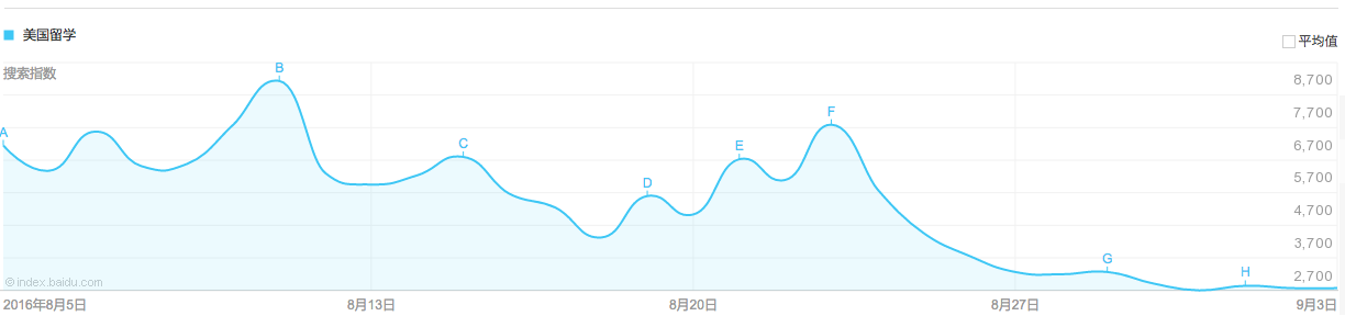 (圖為百度指數(shù)中“美國留學(xué)”搜索量變化趨勢)
