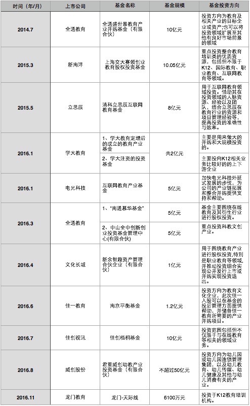 此前,有多家教育機構參投設立投資基金,2015年3月,新南洋出資參與設立上海交大賽領創(chuàng)業(yè)教育股權投資基金,重點投資整合教育培訓類的優(yōu)質(zhì)資源,包括但不限于K12、國際教育、職業(yè)教育、互聯(lián)網(wǎng)教育等領域;2015年5月,立思辰與清科成長成立了互聯(lián)網(wǎng)教育基金,用于互聯(lián)網(wǎng)教育領域投資。此外,立思辰還正在規(guī)劃一個教育產(chǎn)業(yè)基金,用于實現(xiàn)立思辰的教育戰(zhàn)略布局;2016年3月,全通教育參與設立南通慕華基金,基金主要圍繞在線教育及其衍生行業(yè)進行股權投資等。