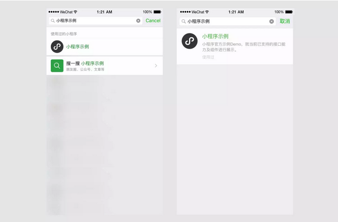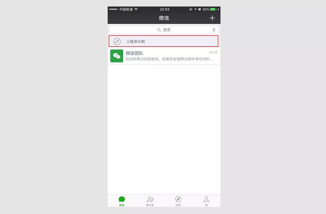 2、用戶在微信客戶端最上方的搜索窗口通過搜索也可獲取小程序。
