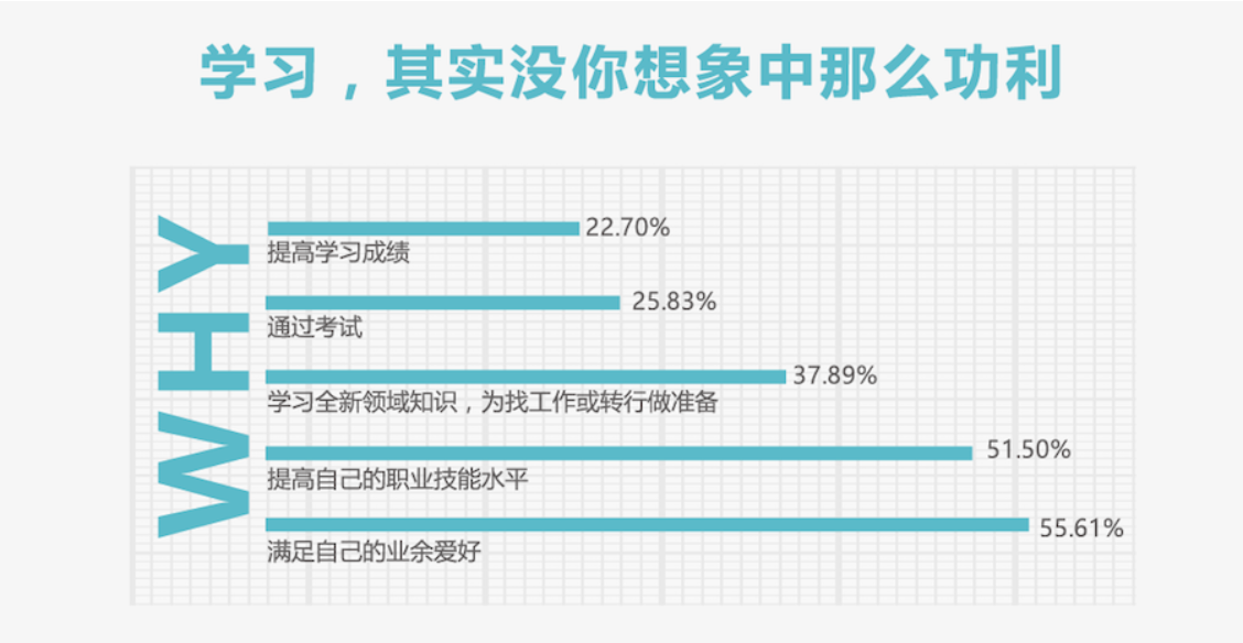 對于大多數(shù)學(xué)習(xí)者,興趣愛好培養(yǎng)和職業(yè)技能的提升是選擇在線學(xué)習(xí)的主要原因。提高學(xué)習(xí)成績及通過考試這類傳統(tǒng)學(xué)習(xí)方式催生的需求,在互聯(lián)網(wǎng)時代下或不適用,即使在學(xué)生群體中仍不是重要因素。