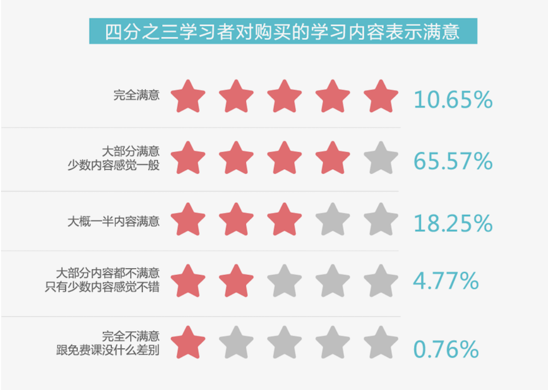 從人們對購得學(xué)習(xí)產(chǎn)品滿意度來看,內(nèi)容質(zhì)量得到了大多數(shù)知識消費者認(rèn)可。取悅消費者不易,學(xué)習(xí)者愿意付錢,或促進了高質(zhì)量的學(xué)習(xí)內(nèi)容供給。