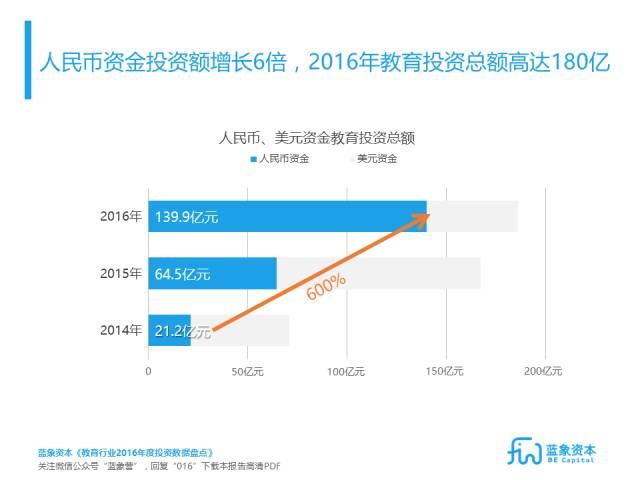 編者按:藍象資本近日發(fā)布了《教育行業(yè)2016年投資數(shù)據(jù)盤點》的報告。報告顯示,人民幣資金超過美元資金成為主流;教育信息化和企業(yè)服務發(fā)展?jié)摿薮?;B2B模式優(yōu)勢顯現(xiàn);少兒英語較成人英語只增不減。