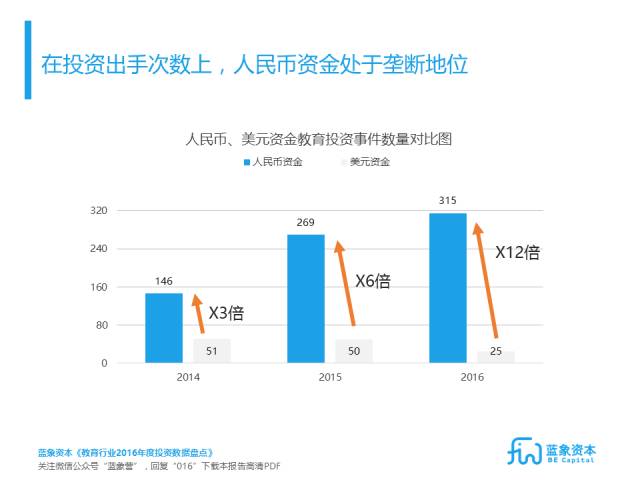 對比2015年和2016年,教育行業(yè)在投資總額小幅增長的情況下,2015年人民幣資金的投資額只有美元資金的一半,2016年卻達到美元資金的三倍。這表明,人民幣資金已經(jīng)成為教育投資的主流。