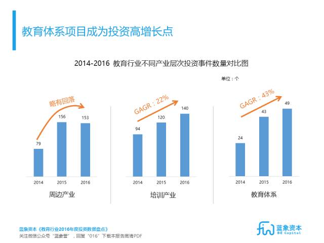 上圖列出了2014年到2016年教育行業(yè)在這三個層次的投資事件數(shù)量,對比來看,增長速度最快的是教育體系的相關(guān)投資,年化增長率約為43%,投資越來越關(guān)注教育體系的創(chuàng)業(yè)項目,教育投資深入內(nèi)核,教育體系將會是投資和創(chuàng)業(yè)的重點方向。
