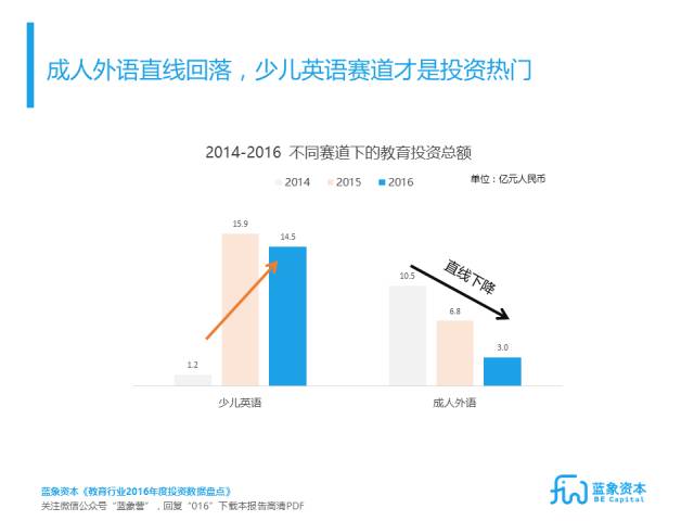 更深一步看,不僅僅是外語培訓,在教育的各個品類,少兒和成人的市場容量都有巨大的差別,少兒的市場通常都要比成人的大,也會更加容易吸引投資。