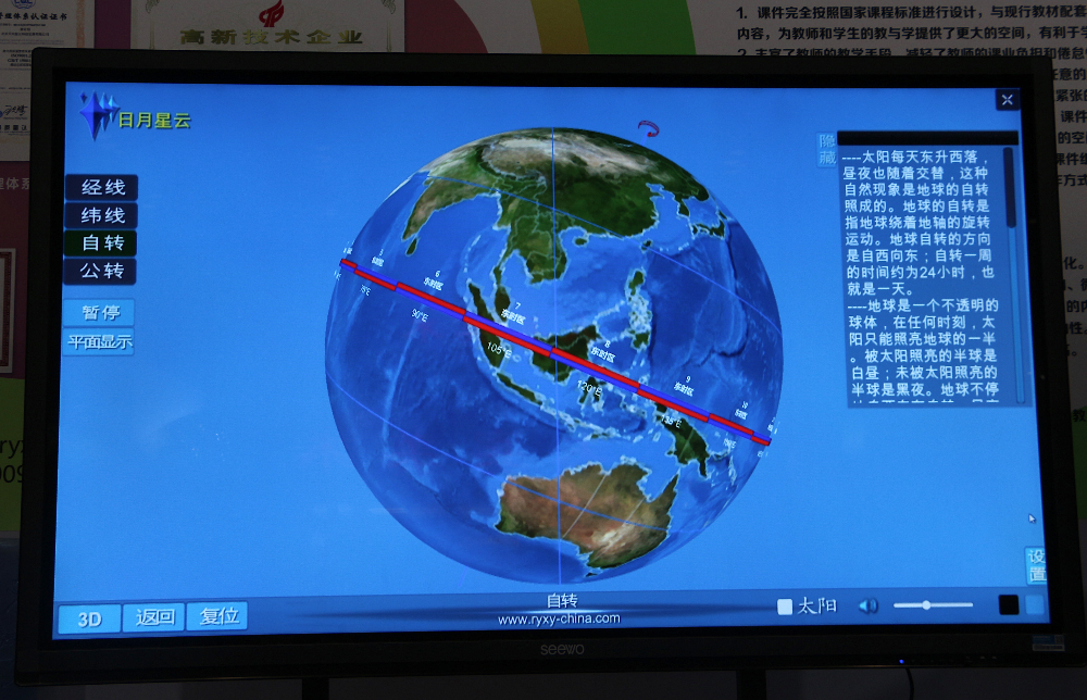 多知當(dāng)天還在現(xiàn)場體驗(yàn)了一堂生動的地理課,帶上普通的3D眼鏡,立體地觀察地球上的每一個(gè)角落。北京日月星云自主研發(fā)的這款教學(xué)軟件,可以3D/2D隨意切換,生動地講解地理知識。