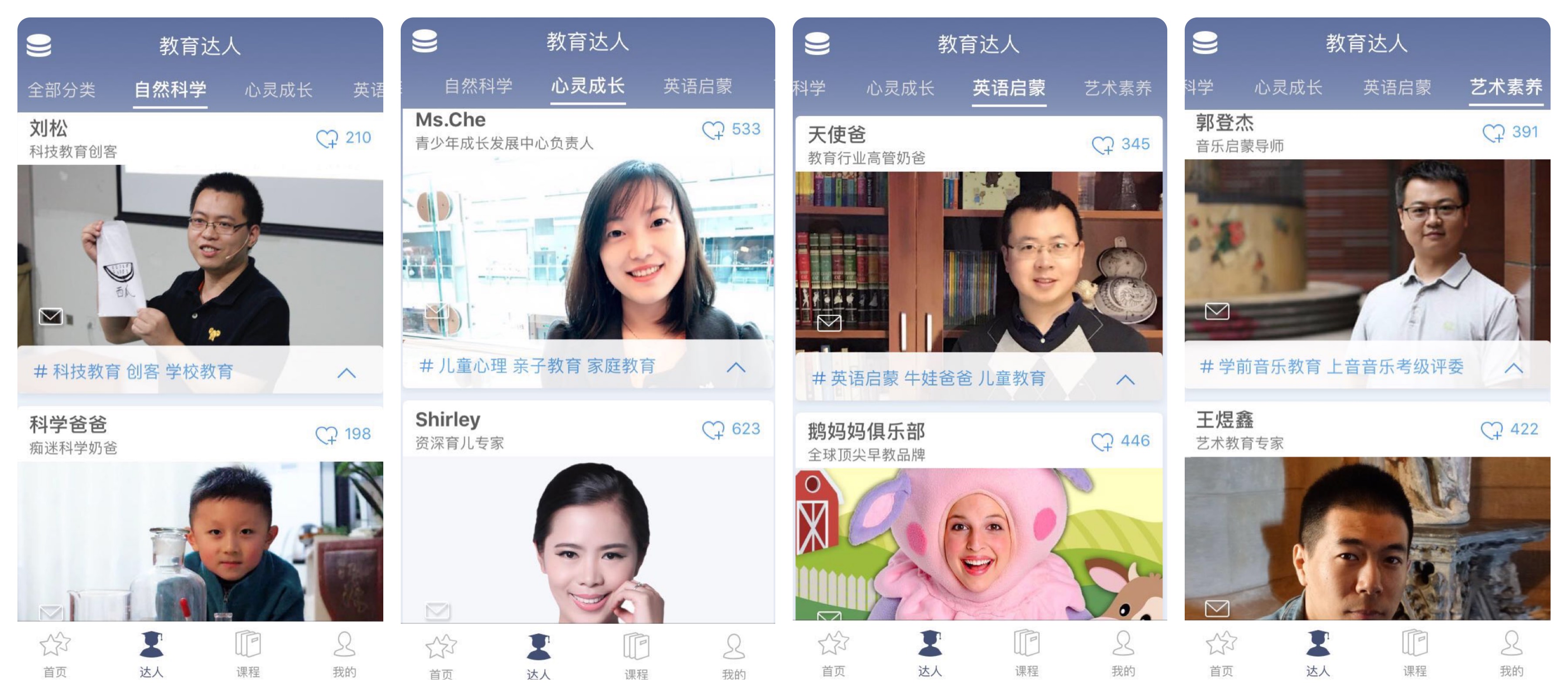 這些達(dá)人分布在藝術(shù)、英語、自然科學(xué)、心理學(xué)教育等領(lǐng)域,他們使用考拉的品牌研發(fā)在線課程。