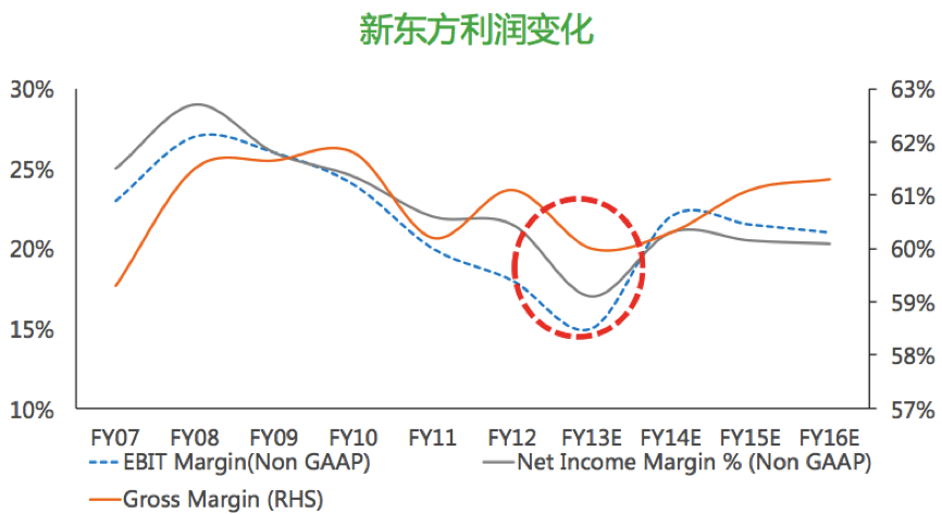 把2005年-2016年在美國(guó)上市公司財(cái)務(wù)數(shù)據(jù)做一個(gè)整體研究,我們會(huì)發(fā)現(xiàn)在2012年前后教育類(lèi)的上市公司財(cái)務(wù)結(jié)構(gòu)發(fā)生了根本性的變化:2012年以前的營(yíng)收利潤(rùn),凈利潤(rùn)是在呈現(xiàn)上市趨勢(shì);但是在2012年前后,現(xiàn)了一個(gè)比較大的營(yíng)收和利潤(rùn)的下滑,擴(kuò)張步伐放緩。以新東方為例,2013年2季度學(xué)習(xí)中心的擴(kuò)張速度降到了歷史最低水平—21%,凈利潤(rùn)率降到20%以下。