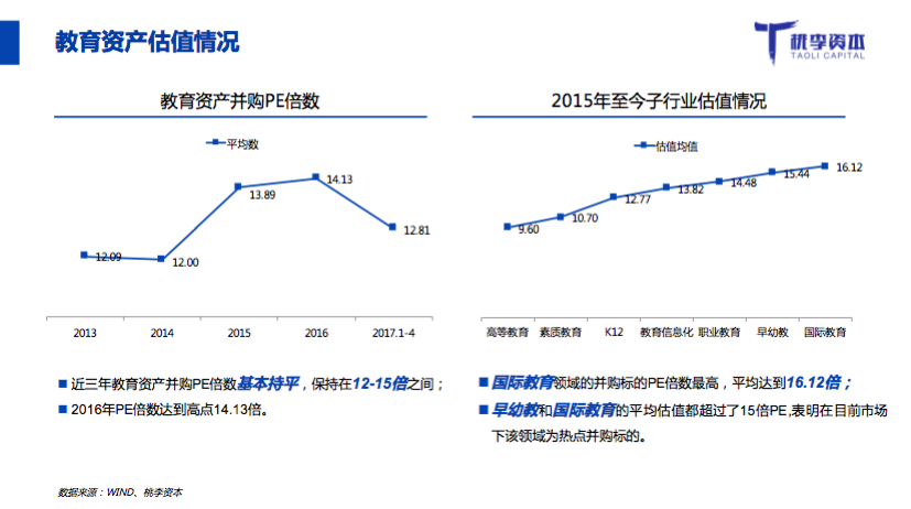 二級市場最近幾年的估值情況來看,教育行業(yè)的并購相對比較穩(wěn)定,約在12到15個月之間,“2016年是市場最熱的時候,可能給了略高的價格,在子行業(yè)的估值中,相對來講可以拿到比較高PE倍數(shù)的是早幼教和國際教育。”