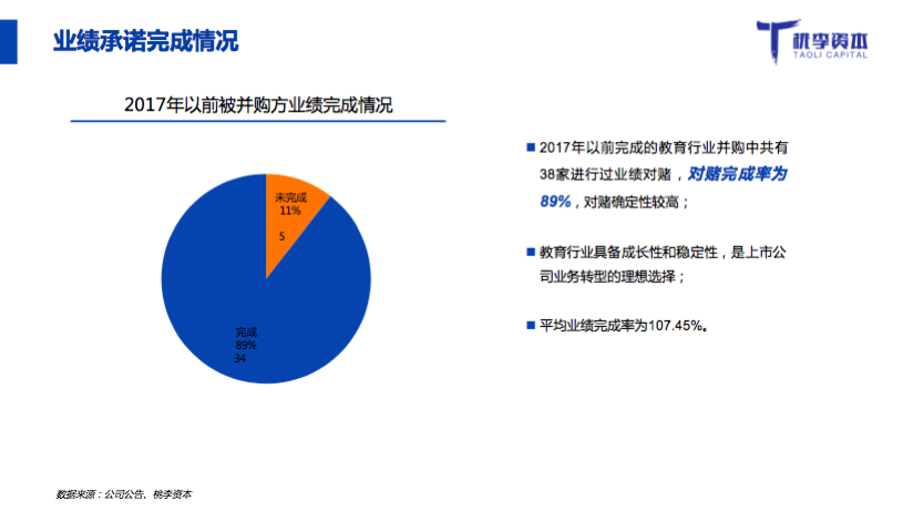 從過往幾年的業(yè)績完成情況看,業(yè)績承諾完成率是90%左右,這可能也從另外一個角度解釋為什么上市公司對教育行業(yè)這么有興趣。
