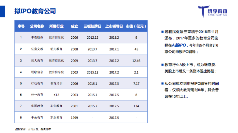 桃李資本創(chuàng)始人張愛志預(yù)測,2020年教育行業(yè)市場規(guī)模將達到3萬億,2020年教育行業(yè)互聯(lián)網(wǎng)滲透率也將達到10%,從資產(chǎn)證券化層面,按照三萬億的市場算,A股這類主流市場將至少有400家以上的教育上市公司。此外,隨著新東方和好未來市值突破100億美元,標(biāo)志著中國教育市場的關(guān)鍵資本節(jié)點。