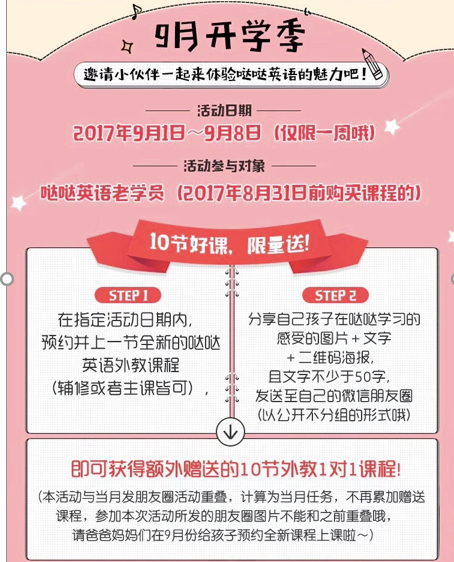 噠噠英語用微信朋友圈定向挖掘已有用戶身邊的潛在客戶。在“開學(xué)季”一周內(nèi),老學(xué)員預(yù)約并上一節(jié)外教課程,在微信朋友圈發(fā)圖文分享上課感受,可以獲贈10節(jié)外教一對一課程。