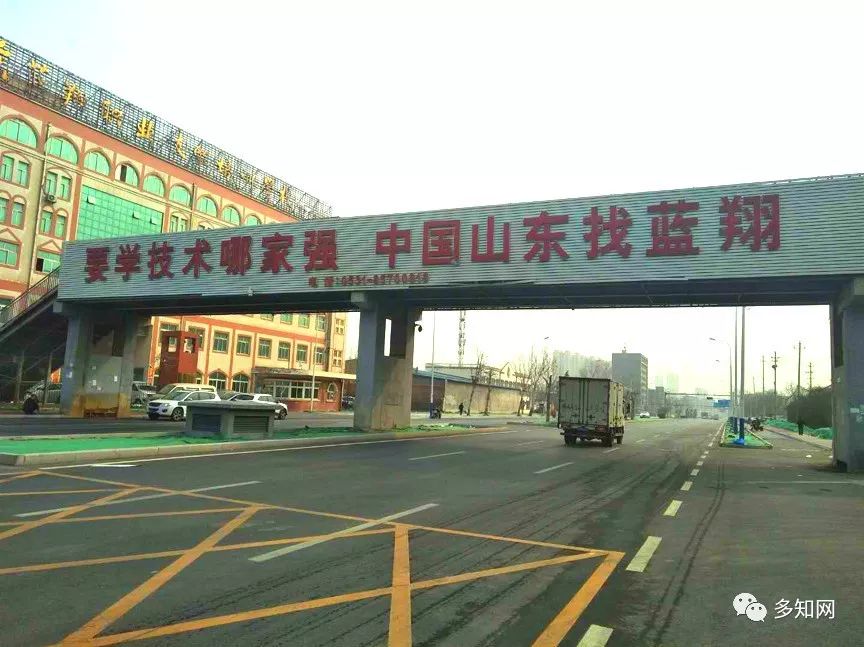 踏入南校區(qū)所在的藍翔中路,過街天橋上就掛著一排醒目的標語——“要學(xué)技術(shù)哪家強,中國山東找藍翔!”——這條在各大衛(wèi)視刷屏十幾年的魔性廣告語,讓很多人認識了藍翔。