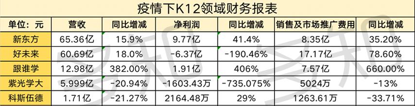 值得注意的是,K12領(lǐng)域的培訓(xùn)機(jī)構(gòu)在疫情期間大推免費(fèi)課,然而營(yíng)銷(xiāo)及推廣費(fèi)用并沒(méi)有降低,反而大大提升,而教育信息化企業(yè)因?yàn)楣W(xué)校暫停線下上課,業(yè)務(wù)受到影響,致使?fàn)I銷(xiāo)費(fèi)用下跌。