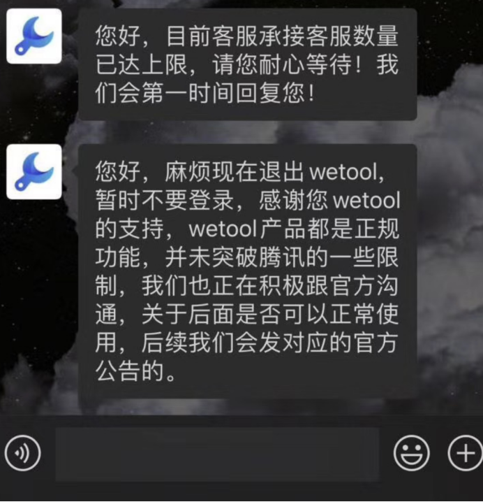 在接到用戶微信號被封號的消息后,WeTool官方客服表示,25日傍晚6點,封信封殺了一波使用WeTool工具的賬號。晚上9點左右,傳出了推寶科技創(chuàng)始人CEO劉睿泳及WeTool客服的通知:“請都退出WeTool,不要再用了,感謝大家的厚愛,我們自認為都是正規(guī)的功能,正在同方溝通。作為微信生態(tài)多年的第三方開發(fā)者,我們尊重官方的決定。也會妥善處理好后續(xù)事宜。”