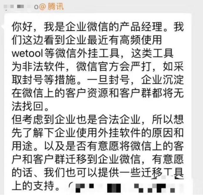 未來企業(yè)微信或許會替代WeTool,此前,微信與企業(yè)微信功能早已打通。昨晚,有傳出的自稱是企業(yè)微信產(chǎn)品經(jīng)理的賬號截圖顯示:“WeTool等微信外掛工具為非法軟件,所以微信官方會嚴打,不過,如有意愿,可以把客戶群遷移至微信企業(yè),微信也會提供遷移工具。”
