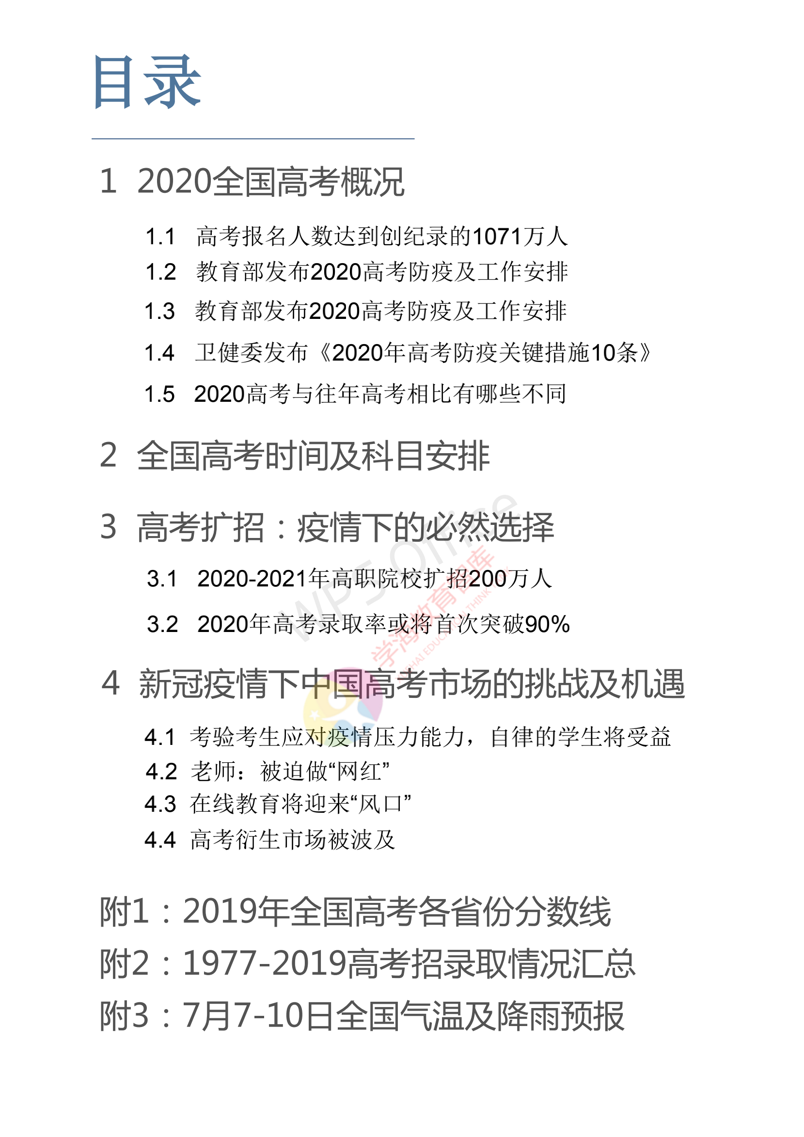 報(bào)告分別從2020全國高考概況、全國高考時(shí)間及科目安排、高考擴(kuò)招:疫情下的必然選擇三個(gè)章節(jié)入手,繼而探討新冠疫情下中國高考市場(chǎng)的挑戰(zhàn)及機(jī)遇。
