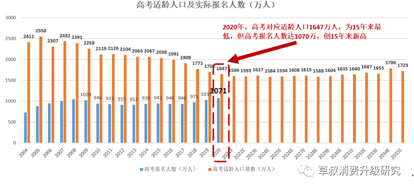 上圖中,我們可以看到,2005-2020年,是上一波出生人口斷崖式下滑(1987-2003)的新生兒參加高考的時間,從2005-2020年,高考人數(shù)的適齡人口,是在逐漸降低的,從2550萬人,降低至1647萬人,但報名參加高考的人數(shù),并沒有隨著適齡人口的降低而降低。2020年高考的人,對應(yīng)的適齡出生人口(2002年)為1647萬人,是近15年來的新低,但2020年高考報名人數(shù),卻創(chuàng)了近15年的新高,達(dá)到1070萬人。