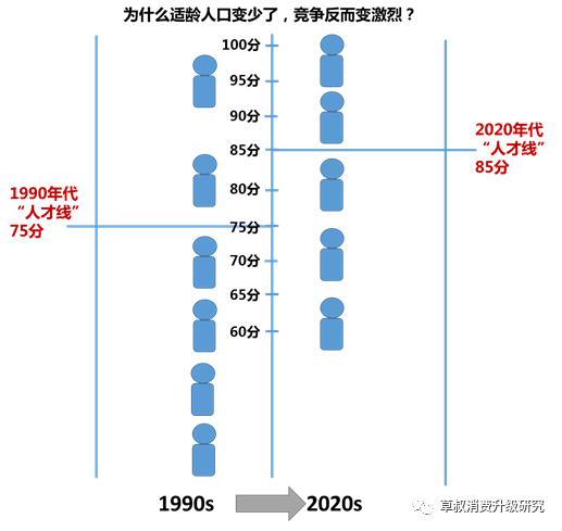 但實(shí)際上,因?yàn)檐妭涓傎惿?,第二名的成績變成?5分,“人才線”提升至了85分,所以實(shí)際上,雖然適齡人口變少了,但是2020年代比1990年代變得更激烈了——這就是“內(nèi)卷”。雖然看上去適齡人口變少了,但是內(nèi)卷滲透率提升了,參與內(nèi)卷的人越來越多,且內(nèi)卷投入的力度還加大了。