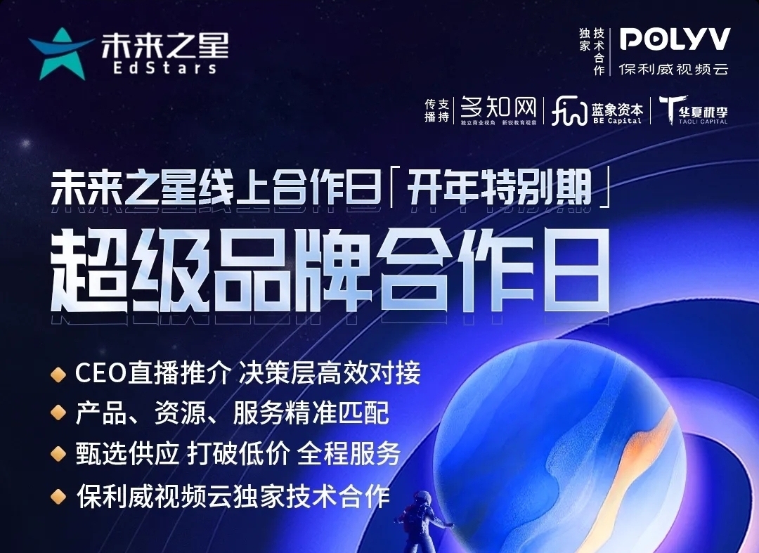 多知網3月19日消息, 3月23日(周二)晚8點,未來之星線上合作日帶來「開年特別版」,攜手7個超級品牌:騰訊教育、京東教育、豌豆思維、樂樂課堂、即構科技、鯊魚公園、多知網,推介教育生態(tài)SaaS中臺、電商平臺入駐、數學思維直播課進園方案、名師錄播雙師課系統(tǒng)、線上教學平臺、STEAM課程材料加盟分銷、《培訓行業(yè)這一年》“內培寶典”等優(yōu)質教育產品及服務。歡迎同學們上線交流!