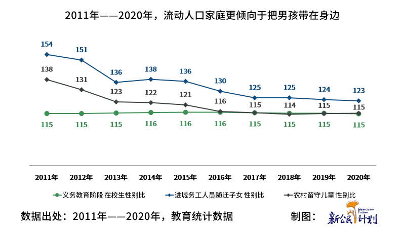 2011年時,進城務(wù)工人員隨遷子女和農(nóng)村留守兒童的性別比均大幅高于全國平均水平,無論是隨遷還是留守,都是男孩更多。此后進城務(wù)工人員隨遷子女和農(nóng)村留守兒童的性別比逐年下降,至2016年,農(nóng)村留守兒童的性別比與全國平均水平已經(jīng)完全一致。2016年,進城務(wù)工人員隨遷子女性別比仍高于全國平均14各百分點,此后繼續(xù)下降,至2020年,仍高于全國平均水平8個百分點。盡管性別選擇的偏好在不斷下降,但是10年了,流動人口家庭依然更傾向于把男孩帶在身邊。