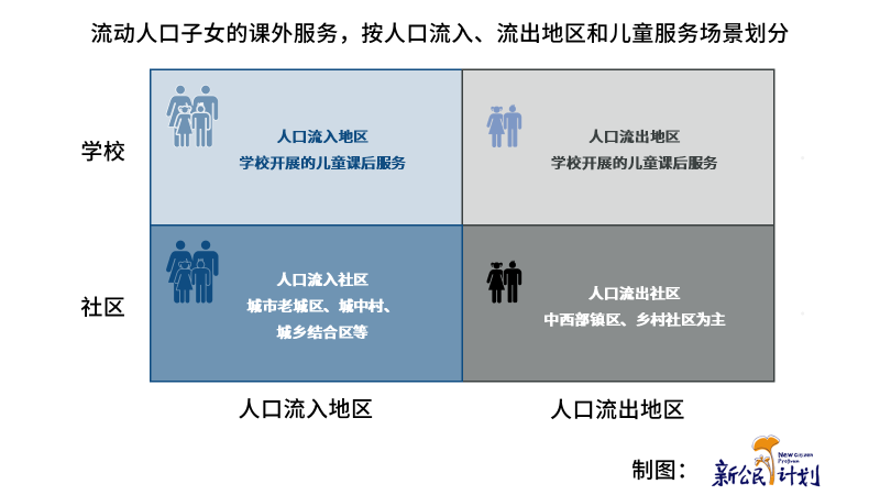 流動人口子女的課外服務(wù),按照人口遷入和遷出,分為人口流入地區(qū)(以流動兒童為主)和人口流出地區(qū)(以留守兒童為主);按照服務(wù)場景,分為在學(xué)校提供的服務(wù)和在社區(qū)提供的服務(wù)。“雙減”政策以來,教育部正在加大力度提升學(xué)校課后服務(wù)水平,因此本文將聚焦于討論社區(qū)場景,在人口流入地區(qū),流動人口子女主要居住在老城區(qū)、城中村或城鄉(xiāng)結(jié)合區(qū);在人口流出地區(qū),則廣泛分布在中西部城鎮(zhèn)和鄉(xiāng)村地區(qū)。