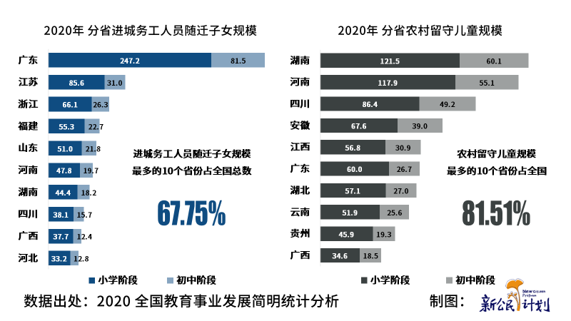 2020年,農(nóng)村留守兒童規(guī)模最多的10個省份分別是湖南、河南、四川、安徽、江西、廣東、湖北、云南、貴州和廣西,占中國農(nóng)村留守兒童在校生總數(shù)的81.51%?! ?/p>